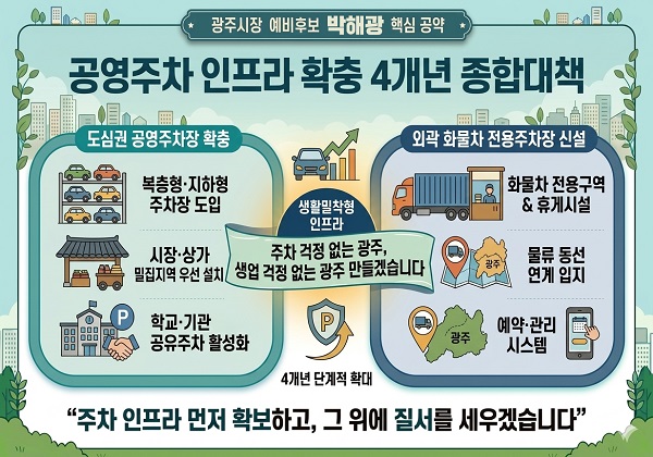 박해광 경기 광주시장 예비후보는 도심 주차난과 화물차 주차 문제를 동시에 해결하기 위한 ‘공영주차 인프라 확충 4개년 종합대책’을 발표했다.